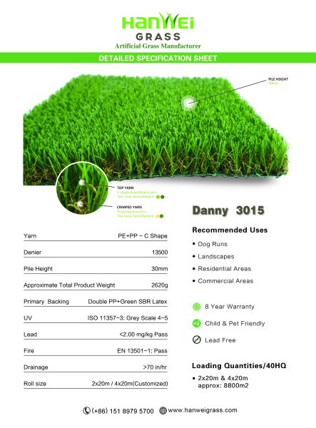 Spend more time in your yard with durable, maintenance-free Danny 3015 artificial grass.Danny 3015 with the pile height of 30mm. Plush and soft underfoot,Danny 3015is the perfect alternative to natural grass. Save money and time.Danny 3015 offers superior resilience and permeability, UV protection, and environmentally friendly construction.