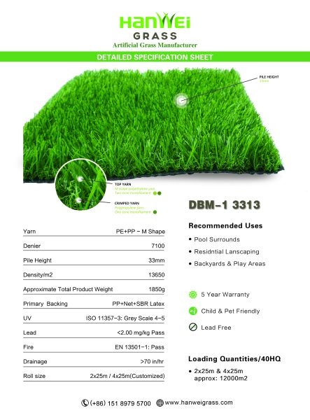 DBM-1 3313 with the pile height of 33mm.IT is one of our best-selling artificial turf products and a very popular selection for high-traffic areas. It’s soft-to-the-touch but still durable, making it ideal for backyards, residential lanscaping, pool surrounds and play areas. This turf model is vibrant green for a super lush natural grass look.