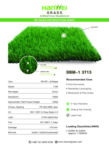 DBM-1 3713 with the pile height of 37mm.IT is one of our best-selling artificial turf products and a very popular selection for high-traffic areas. It’s soft-to-the-touch but still durable, making it ideal for backyards, residential lanscaping, pool surrounds and play areas. This turf model is vibrant green for a super lush natural grass look.