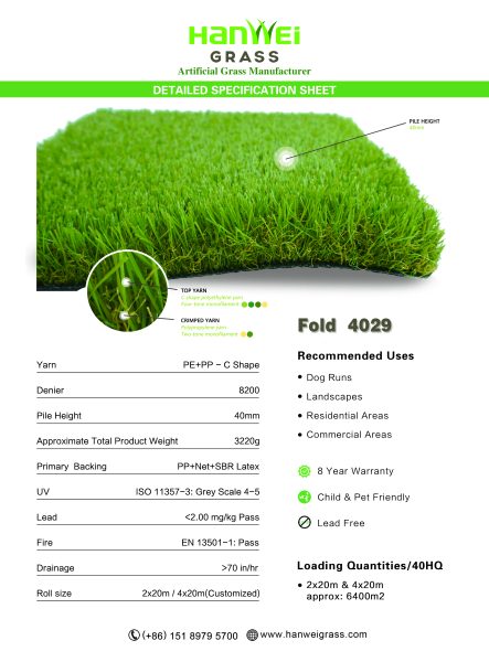 Fold 4029 with the pile height of 40mm. It provides excellent memory without feeling stiff or crunchy. The C-Shaped blades provide the right balance of ballast while still remaining comfortable to the touch and looking like natural grass blades.