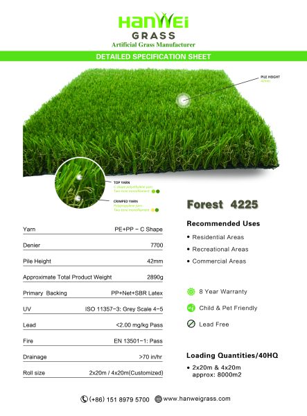 Hanwei grass advanced artificial green grass technology enables a wealth of opportunities to completely transform your outside spaces where real flora and fauna struggles to grow or thrive. These include low-light, little-used neglected spaces. Designed by our own in-house research and development team here in the UK, Forest 4225 with the pile height of 42mm.It features a lighter green hue to mirror a perfect natural-look lawn in low light to lift and enhance dull and dark garden areas.