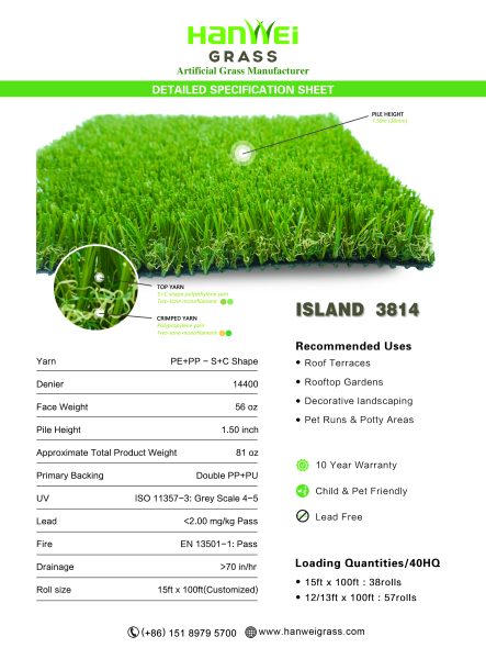 ISLAND 3814 is a Soft texture, realistic feel artificial grass. Featuring a durable S+C blade shape and 38mm (1.50inch)pile height, this artificial grass is perfect for residential yards, playgrounds, and pet kennels.