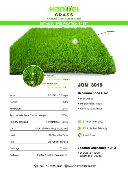 JON 3019 with the pile height of 30mm.JON 3019 is excellent for commercial and residential landscapes, playgrounds, pets areas, and public parks. It feels soft to the touch and creates beautiful, premium always green lawns.