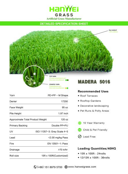 MADERA 5016 that stands out with its perfect balance of softness, safety, and durability.The pile height is 50mm(1.97 inch). Designed with multi-colored blades and dense thatch create a lush, natural appearance while offering exceptional resilience. Ideal for high-traffic areas, this is the ultimate choice for those seeking beauty and performance in one.