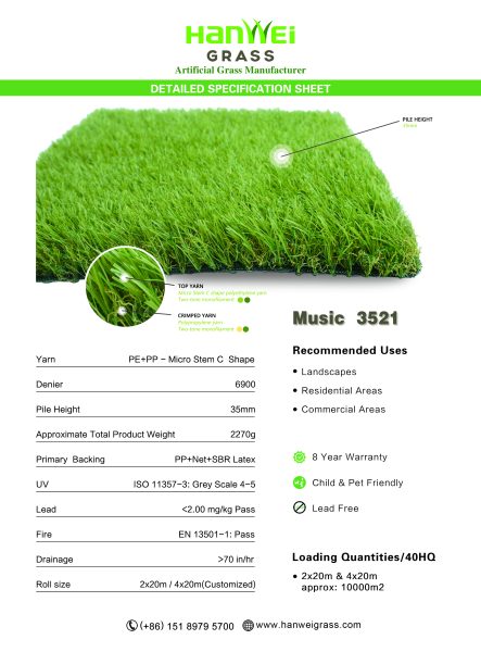 Music 3521 will brighten those shaded garden areas to create the natural look and feel of a lush, green lawn.The pile height is 35mm. It creates that extra fresh look and feel for your garden.This artificial grass is perfect for any shaded garden or terrace. Durable and hardwearing, yet still luxuriously soft in both look and feel. Child and pet friendly.