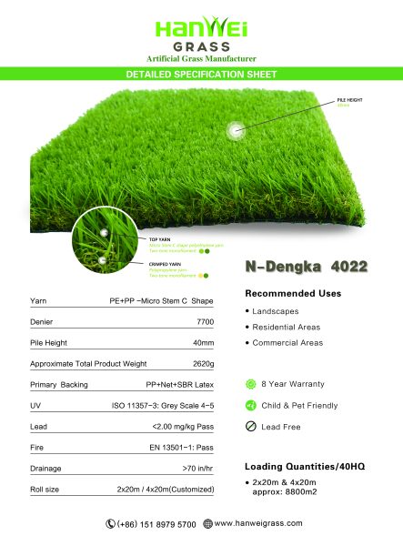 N-Dengka 4022 for its ultra-realistic appearance and feel.The pile heightis 40mm.N-Dengka 4022 with an extra soft artificial grass yarn for a luscious cushion feel, as well as a unique dead grass infill for that authentic natural look. This product looks spectacular in all gardens, and is a particularly popular choice for balconies, terraces, and patios. Child and pet friendly.