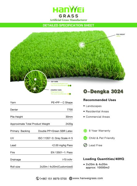 O-Dengka 3024 with the pile height of 30mm.This product is the standard for durable, long-lasting turf. Unique C Shape blades stand straighter under varying pressure and retain their original shape and blade position while ensuring that your lawn maintains its fresh green look every day.