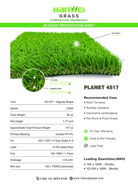 We’re proud to introduce PLANET 4517, a 45mm (1.77 inch) high artificial lawn that effortlessly transforms outdoor spaces into lush sanctuaries. Designed with Commercial and pets in mind,PLANET 4517 is designed for maximum drainage, long-lasting durability as well as providing low surface temperatures and an elegant combination of natural colors for ultra-realistic natural beauty.