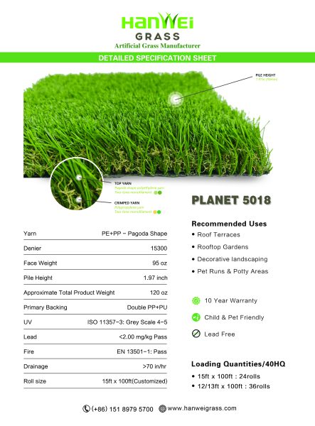 We’re proud to introduce PLANET 5018, a 50mm (1.97 inch) high artificial lawn that effortlessly transforms outdoor spaces into lush sanctuaries. Designed with Commercial and pets in mind,Texas 5018 is designed for maximum drainage, long-lasting durability as well as providing low surface temperatures and an elegant combination of natural colors for ultra-realistic natural beauty.