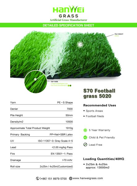 S70 Football grass 5020 with the pile height of 50mm.It features S-shape that enhance sliding comfort through optimized texture. With a higher density than conventional turf, it is suited for intensive-use football fields for professional sports clubs and stadiums.