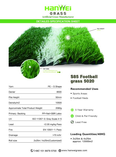 S85 Football grass 5020 with the pile height of 50mm.It features S-shape that enhance sliding comfort through optimized texture. With a higher density than conventional turf, it is suited for intensive-use football fields for professional sports clubs and stadiums.