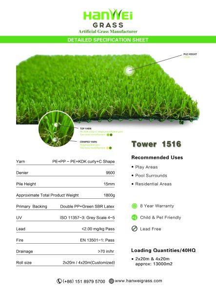 Soft to the touch, Tower 1516 is a popular choice for lawns at homes with families and pets who love to play outside.Tower 1516 with the pile height of 15mm. Eco-friendly Tower 1516 transforms imperfect, uneven grass into a bright green wonderland of perfectly manicured lawn.